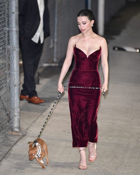 Speaking of Mikey Madison, I don’t want to be dramatic, but I think she might be one of the most beautiful women alive. Her styling (by Jamie Mizrahi!) has been impeccable of late, but I especially love this velvet Mugler dress she wore for Kimmel. And these photos of her walking her dog? Soooo c*nty. (Complimentary.) I’d have them framed, if they were of me.